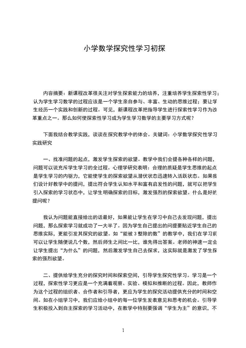 下面我结合教学实践,谈谈在探究教学中的体会。关键词:小学数学探究性学习实践研究