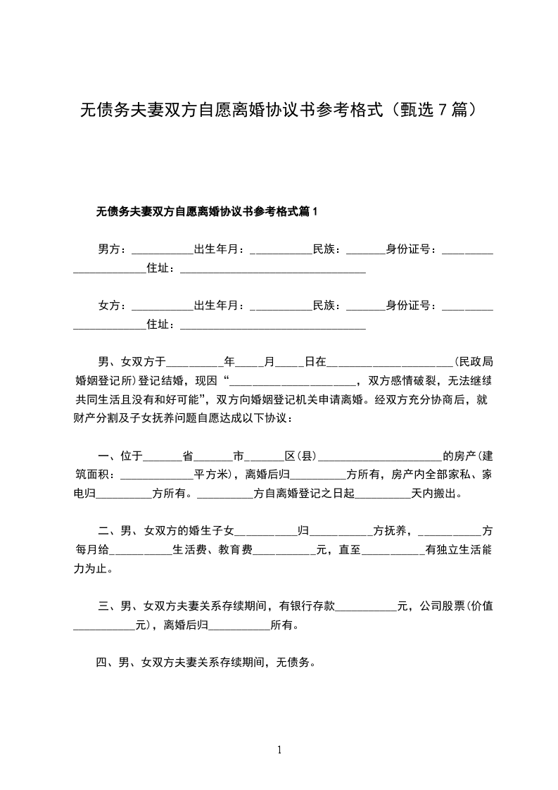 无债务夫妻双方自愿离婚协议书参考格式篇7