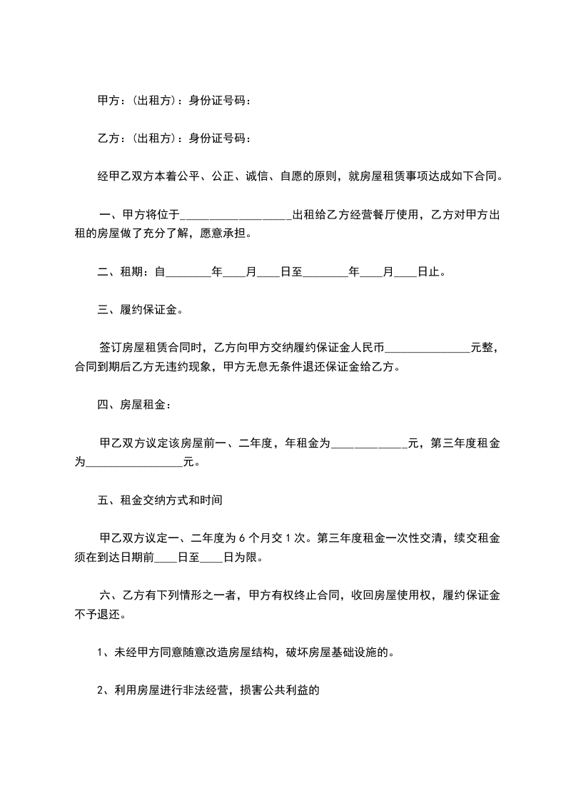 一、甲方将位于___________________出租给乙方经营餐厅使用,乙方对甲方出租的房屋做了充分了解,愿意承担。