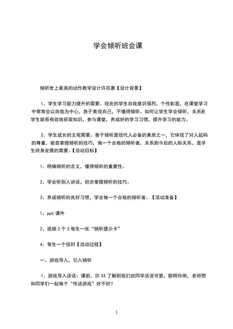 2、学生成长的主观需要。善于倾听是现代人必备的素质之一,它体现了对人起码的尊重,能否掌握倾听的技巧,做一个合格的倾听者,关系到今后的人际关系,是学生终身发展的需要。【活动目标】