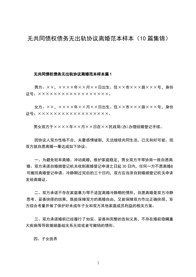 无共同债权债务无出轨协议离婚范本样本篇10