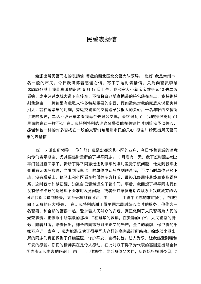(2) x派出所领导: 你们好!我是宏都筑景小区的业户,今日怀着真诚的谢意向你们表示感谢,尤其要感谢贵所的丁得平同志。 3月底有一天,我下班时遗忘锁上车门就挺直回家了,贵所丁得平同志巡逻到停车处准时发觉了该问题,他先到我车上查看有无破坏痕迹,当看到我车卡上的单位电话后立刻联系我,不过当时单位已经下班,没有联系上。他马上和小区看车师傅等多方打听,最终几经周转最终和我取得联系。这时我才如梦初醒,知道自己竟然遗忘了锁车门。事后,我回想丁得平同志假如没有仔细细致的巡逻也不会准时发觉问题,或者他打单位电话没联系上我就放弃的话,可能我都会遭到损失,甚至丢车都有可能。由 丁得平同志的准时援手,帮我挽回了无形的巨大损失。 在此我特别感谢丁得平同志周到细心准时的服务,他作为一名警察,和全部的警察一起,爱护着人民群众的安危,真正做到了人民警察为人民的光荣职责。正像歌中所唱歌的那样:“在繁华的城镇,在安静的山谷,人民警察的身影,陪着月落,陪着日出,神圣的国徽放射出正义的光芒,金色的盾牌,保卫着的千家万户。” 当今_,我为能遇见像丁得平同志这样的高尚品行所感动。始终以来派出所的同志们真正做到了仔细巡逻,守护平安,言行礼貌、助人为乐,让我感受到暖和、平安的感觉。你们的精神实在是令人感动,在此对以丁得平为代表的富国派出所全体同志表示我由衷的感谢! 由 工作繁忙,最近身体又欠佳,所以始终拖到今日,才抽空写了这封表扬信。不过我心里始终没有遗忘,今后也不会遗忘,由 有人民警察在我们身边,美好平安的生活就在我们身边! 宏都筑景小区业户: xxx(签名) 本文地址: l