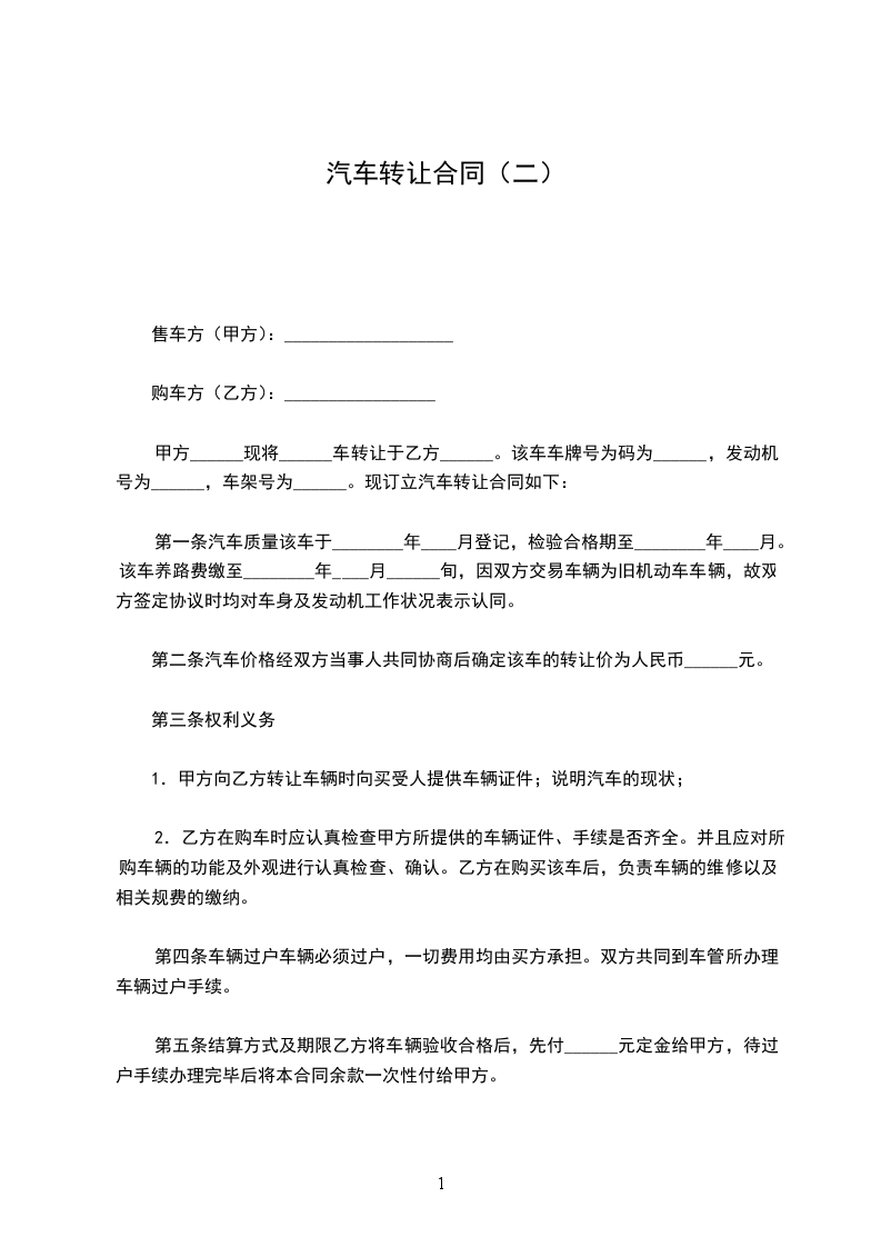 第二条汽车价格经双方当事人共同协商后确定该车的转让价为人民币______元。