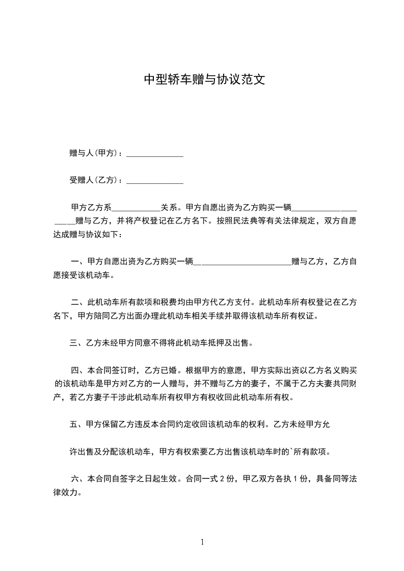甲方乙方系____________关系。甲方自愿出资为乙方购买一辆_____________________赠与乙方,并将产权登记在乙方名下。按照民法典等有关法律规定,双方自愿达成赠与协议如下: