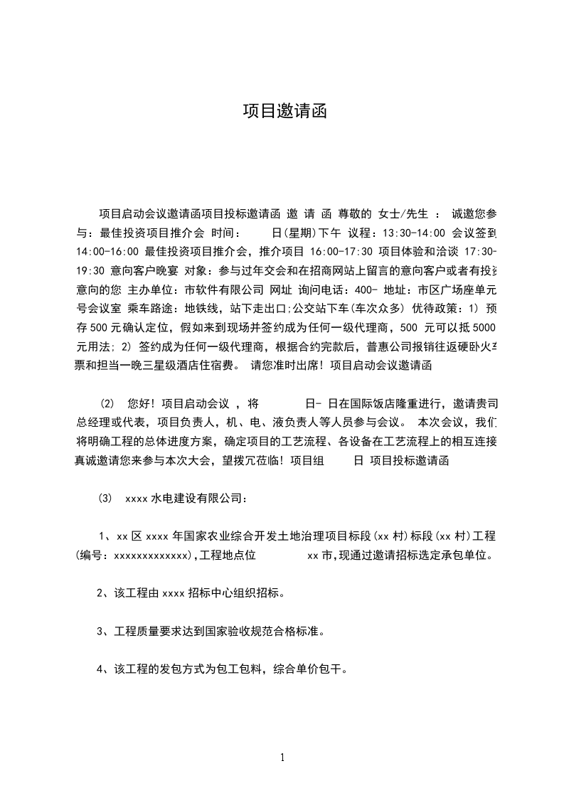 项目启动会议邀请函项目投标邀请函 邀 请 函 尊敬的 女士/先生 : 诚邀您参与:最佳投资项目推介会 时间: 日(星期)下午 议程:13:30-14:00 会议签到 14:00-16:00 最佳投资项目推介会,推介项目 16:00-17:30 项目体验和洽谈 17:30-19:30 意向客户晚宴 对象:参与过年交会和在招商网站上留言的意向客户或者有投资意向的您 主办单位:市软件有限公司 网址 询问电话:400- 地址:市区广场座单元号会议室 乘车路途:地铁线,站下走出口;公交站下车(车次众多) 优待政策:1) 预存500元确认定位,假如来到现场并签约成为任何一级代理商,500 元可以抵5000元用法; 2) 签约成为任何一级代理商,根据合约完款后,普惠公司报销往返硬卧火车票和担当一晚三星级酒店住宿费。 请您准时出席! 项目启动会议邀请函