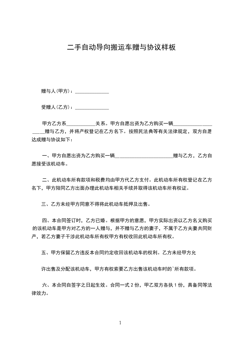 一、甲方自愿出资为乙方购买一辆________________________赠与乙方,乙方自愿接受该机动车。