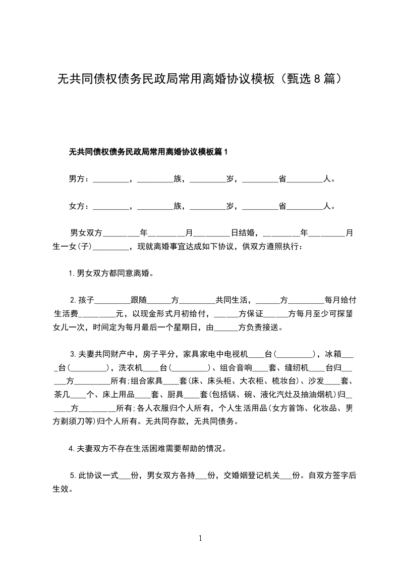 无共同债权债务民政局常用离婚协议模板篇8
