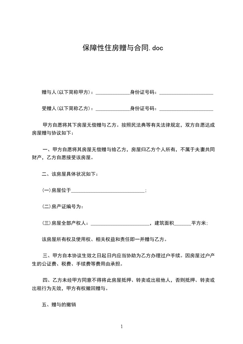 受赠人(以下简称乙方):______________身份证号码:______________________