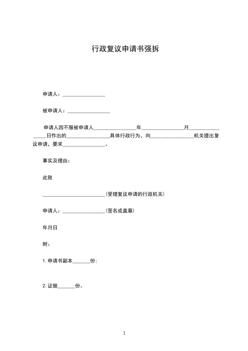 申请人因不服被申请人_________________年_________________月_________________日作出的_________________具体行政行为,向_________________机关提出复议申请,要求_________________。