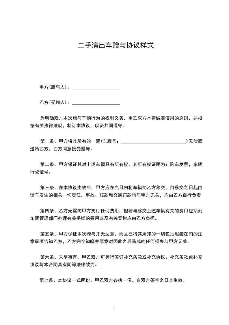 一、甲方将其所有_________________车(车牌号:___________________)赠送给乙方,其所有权证明为:车辆行驶证、车辆合格证、机动车登记证书、车辆购置税完税证明。