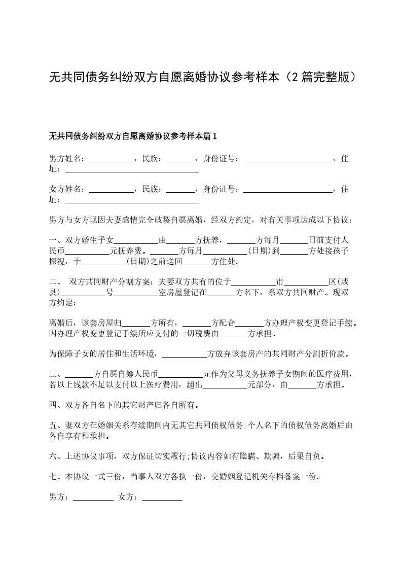 无债务纠纷夫妻双方自愿协议离婚范本范文篇2