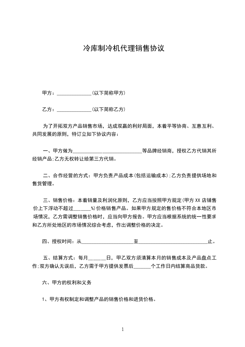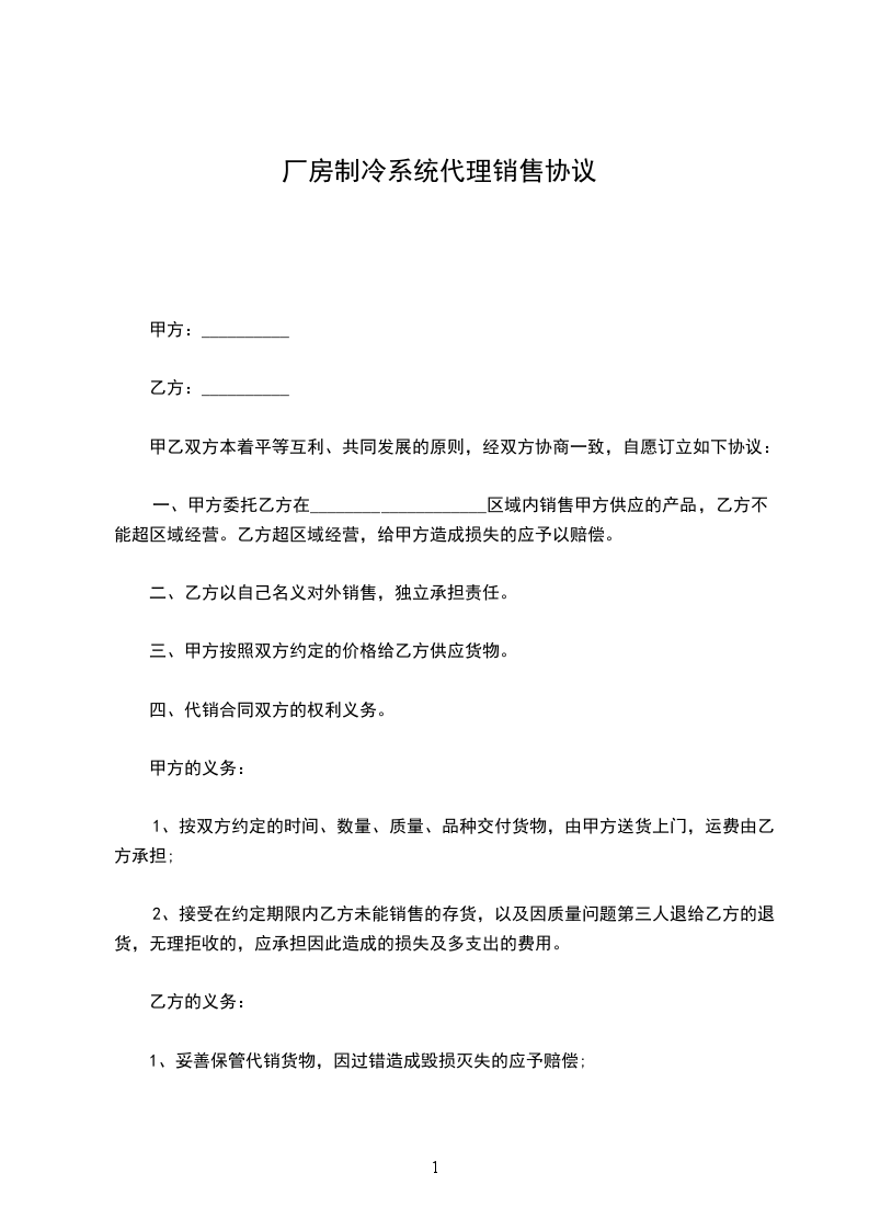1、甲方保证给乙方提供产品均为正版产品并保证乙方所在区域即________地区的独家代理权,且不得自行直接向乙方所在区域的客户代售本合同的标的物。