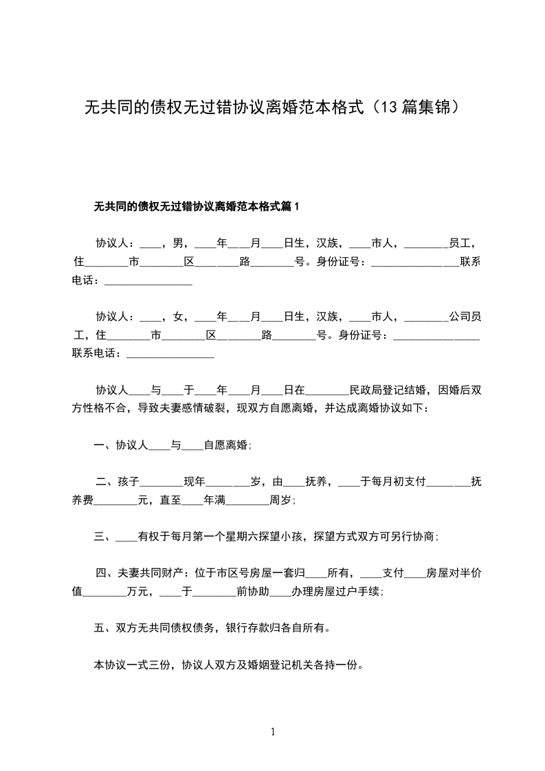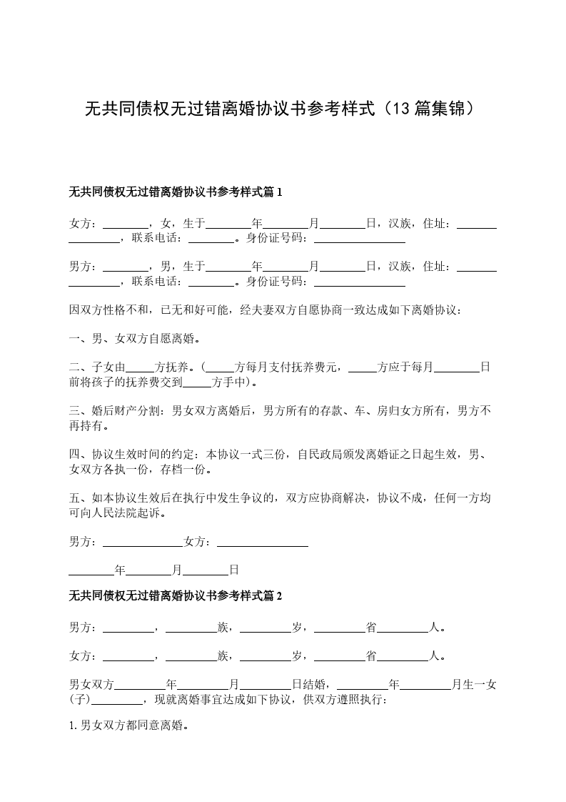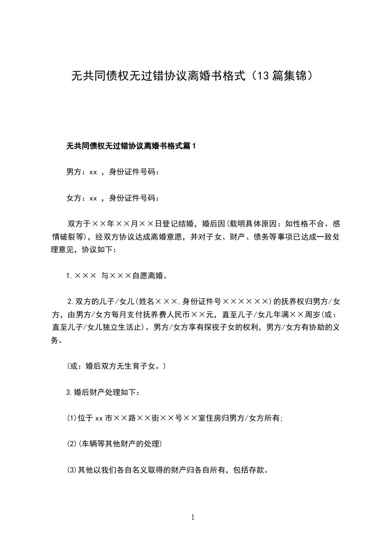 无共同债务无过错离婚协议书参考样板篇13