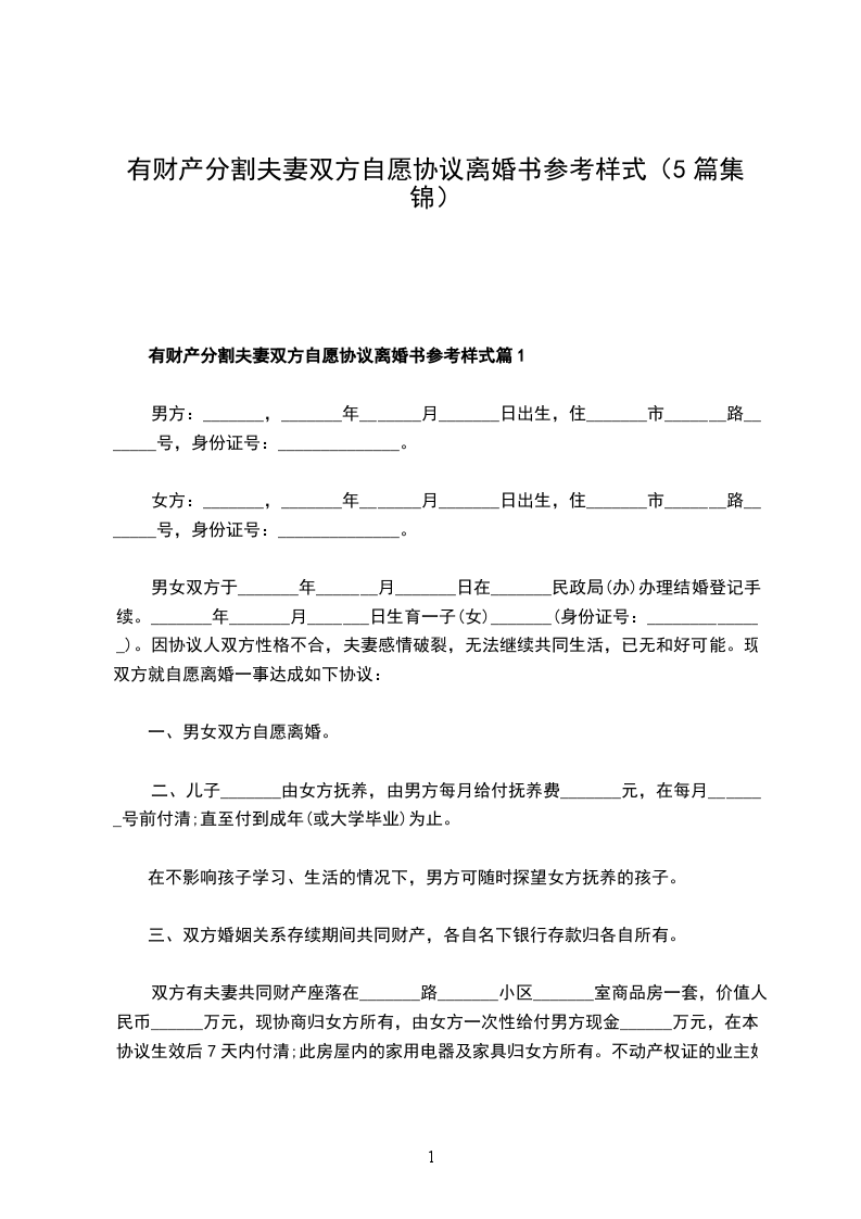 有财产分割夫妻双方自愿协议离婚书参考样式篇5