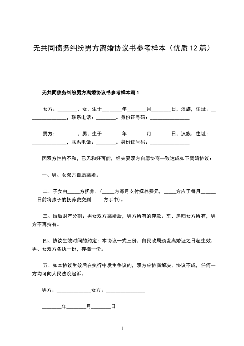无共同债务纠纷男方离婚协议书参考样本篇12