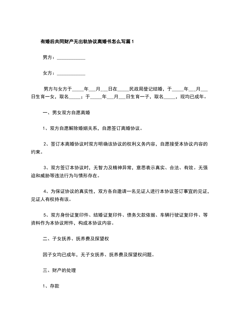 有婚后共同财产无出轨离婚协议书参考样例篇1