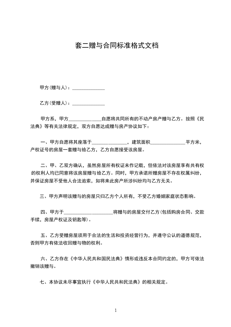 一、甲方自愿将其座落于_______________,建筑面积_______________平方米,产权证号的房屋一套赠与给乙方,乙方自愿接受该房屋。