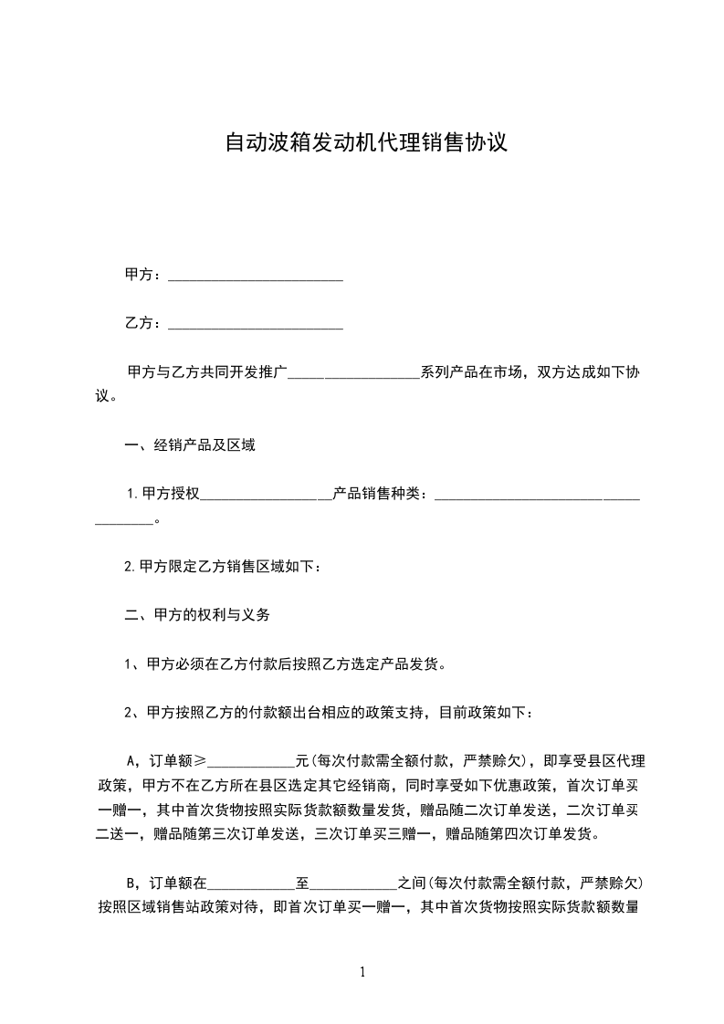 B,订单额在____________至____________之间(每次付款需全额付款,严禁赊欠)按照区域销售站政策对待,即首次订单买一赠一,其中首次货物按照实际货款额数量发货,赠品随二次订单发送,二次订单买二送一,赠品随第三次订单发送,三次订单买三赠一,赠品随第四次订单发货。甲方可以在乙方所在县区建立新的销售站。