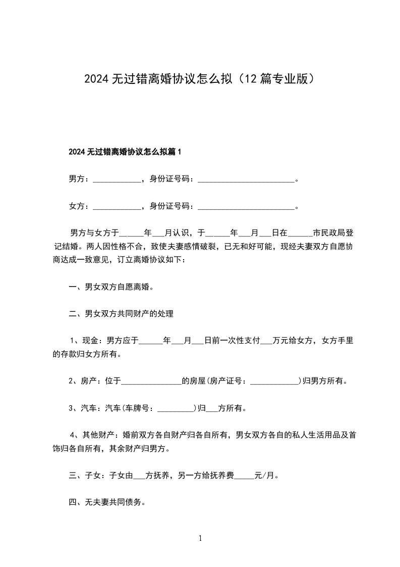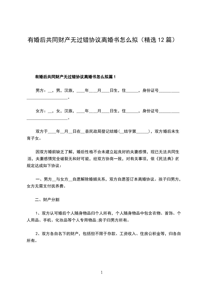 有婚后共同财产无过错协议离婚书怎么拟篇12