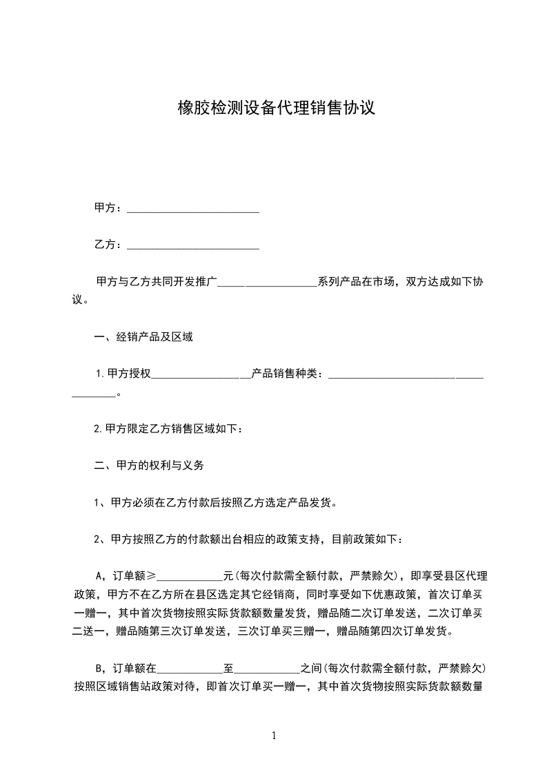 B,订单额在____________至____________之间(每次付款需全额付款,严禁赊欠)按照区域销售站政策对待,即首次订单买一赠一,其中首次货物按照实际货款额数量发货,赠品随二次订单发送,二次订单买二送一,赠品随第三次订单发送,三次订单买三赠一,赠品随第四次订单发货。甲方可以在乙方所在县区建立新的销售站。