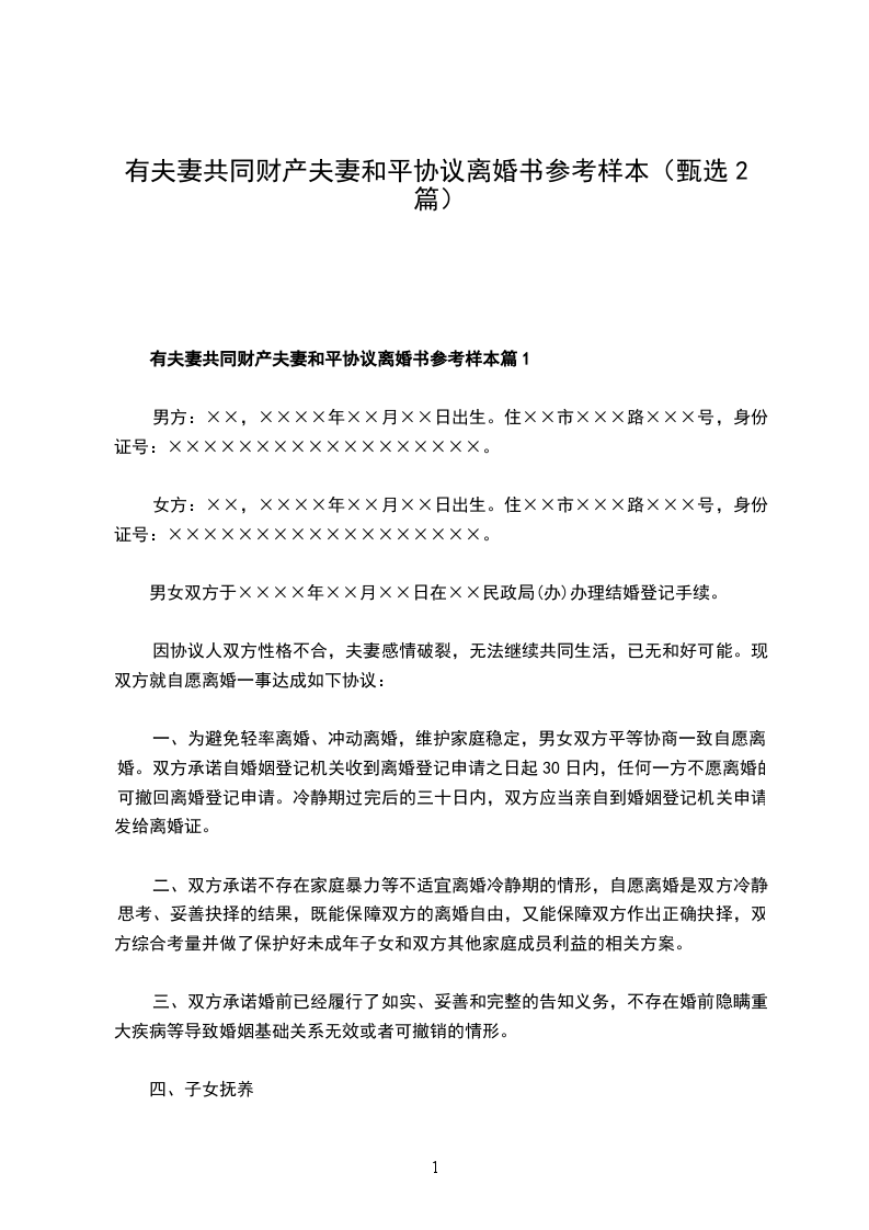 无共同的债权夫妻和平协议离婚范本模板篇2