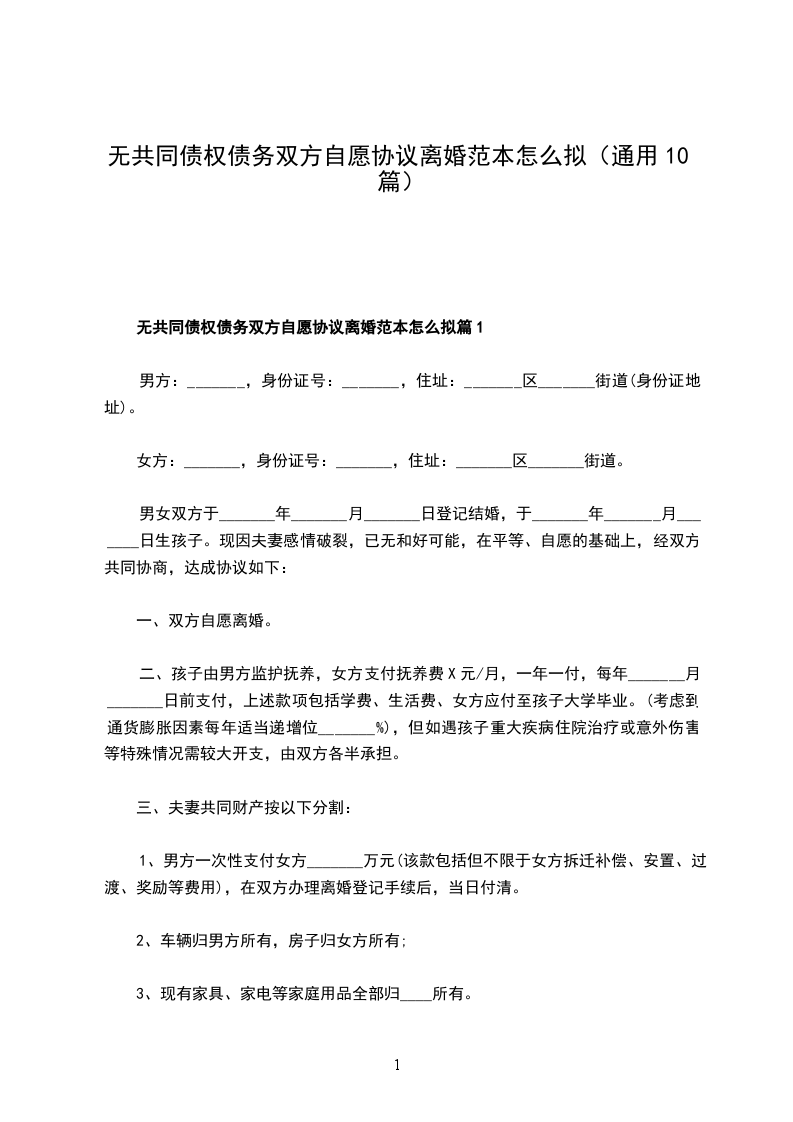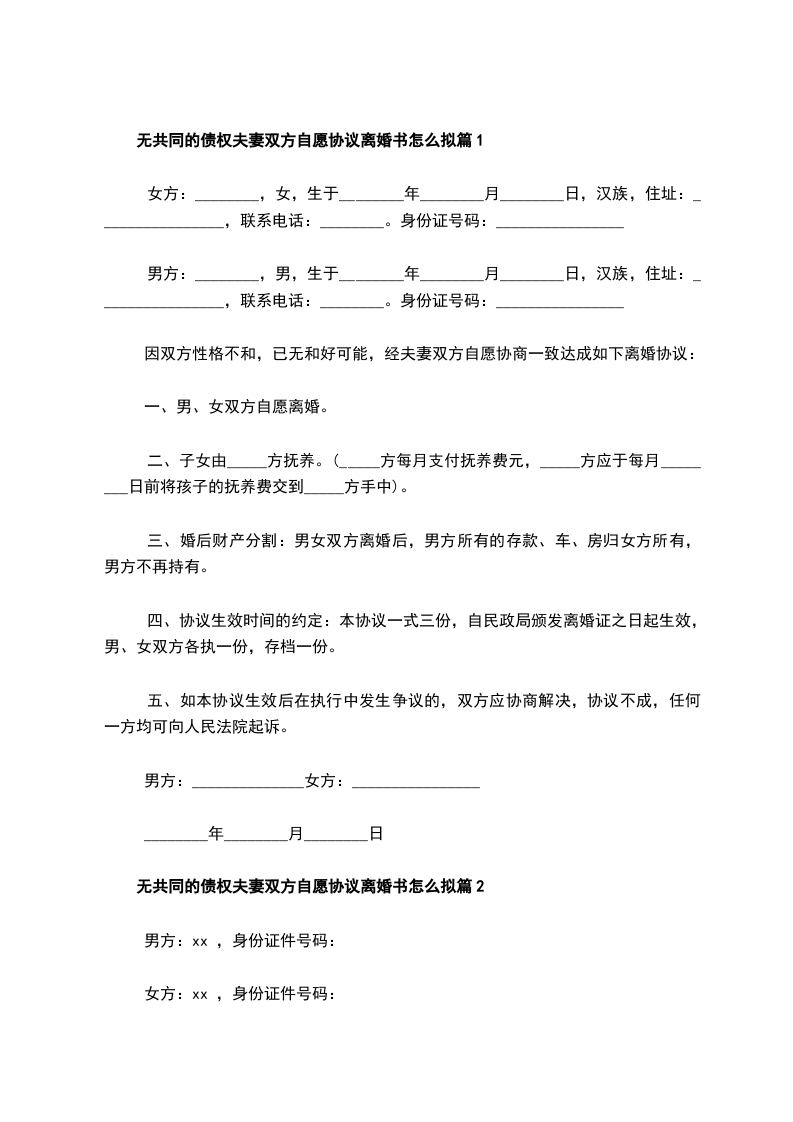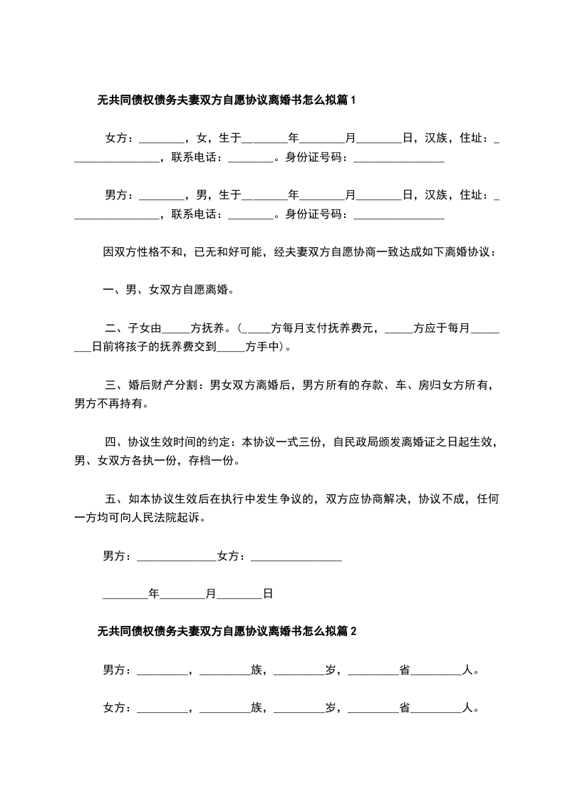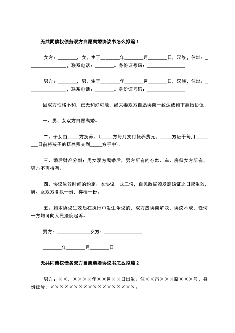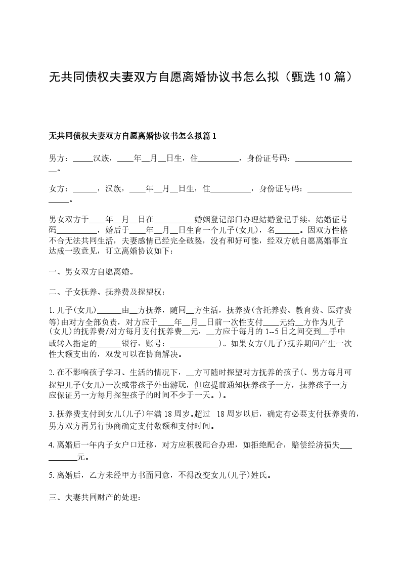 无共同债权债务夫妻双方自愿协议离婚书怎么拟篇9