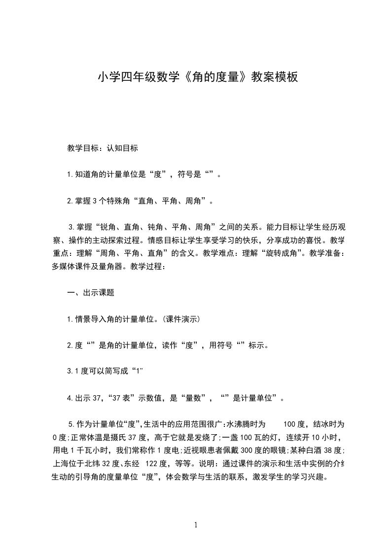一、教学目标认识平角和周角,知道锐角、直角、钝角、平角和周角之间的关系,并能根据角的度数进行分类。会用量角器、三角尺画不同度数的角。