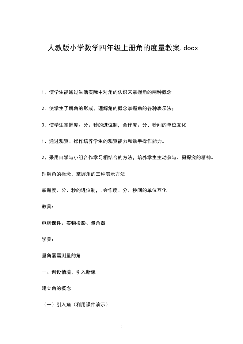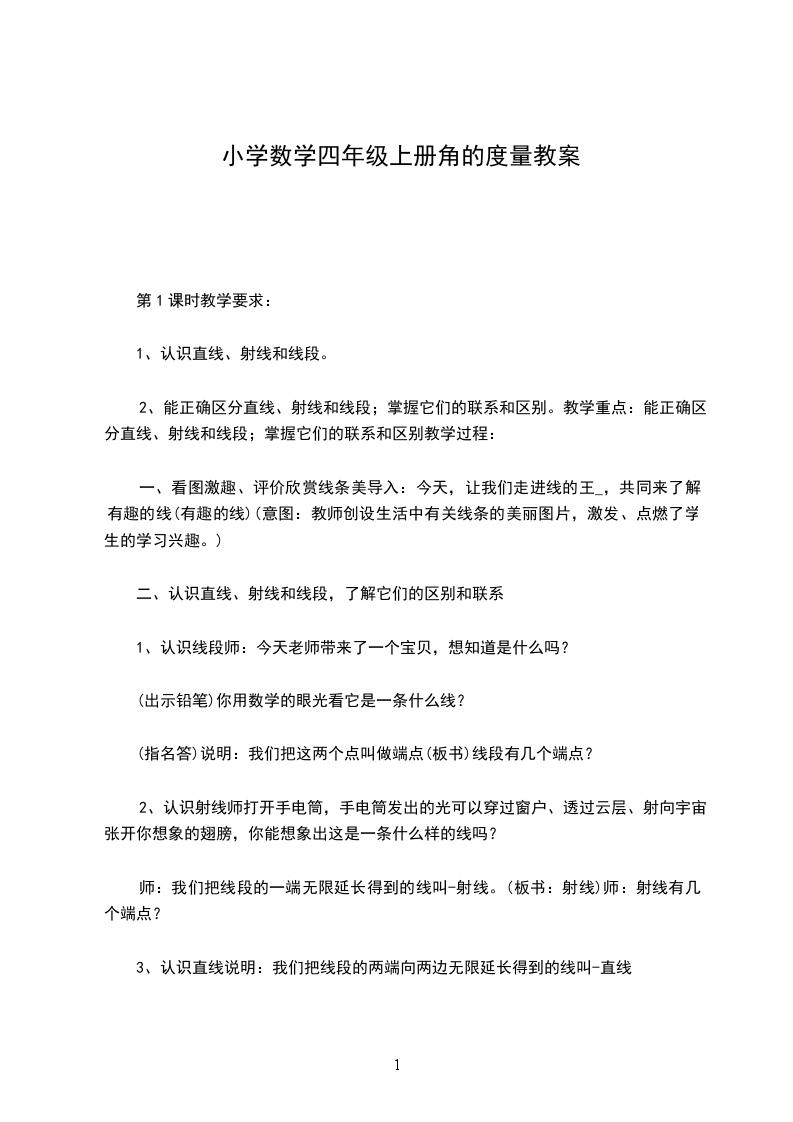 (1)认识量角器、角的度量单位,会在量角器上找出大小不同的角,并知道它的度数,会用量角器量角。