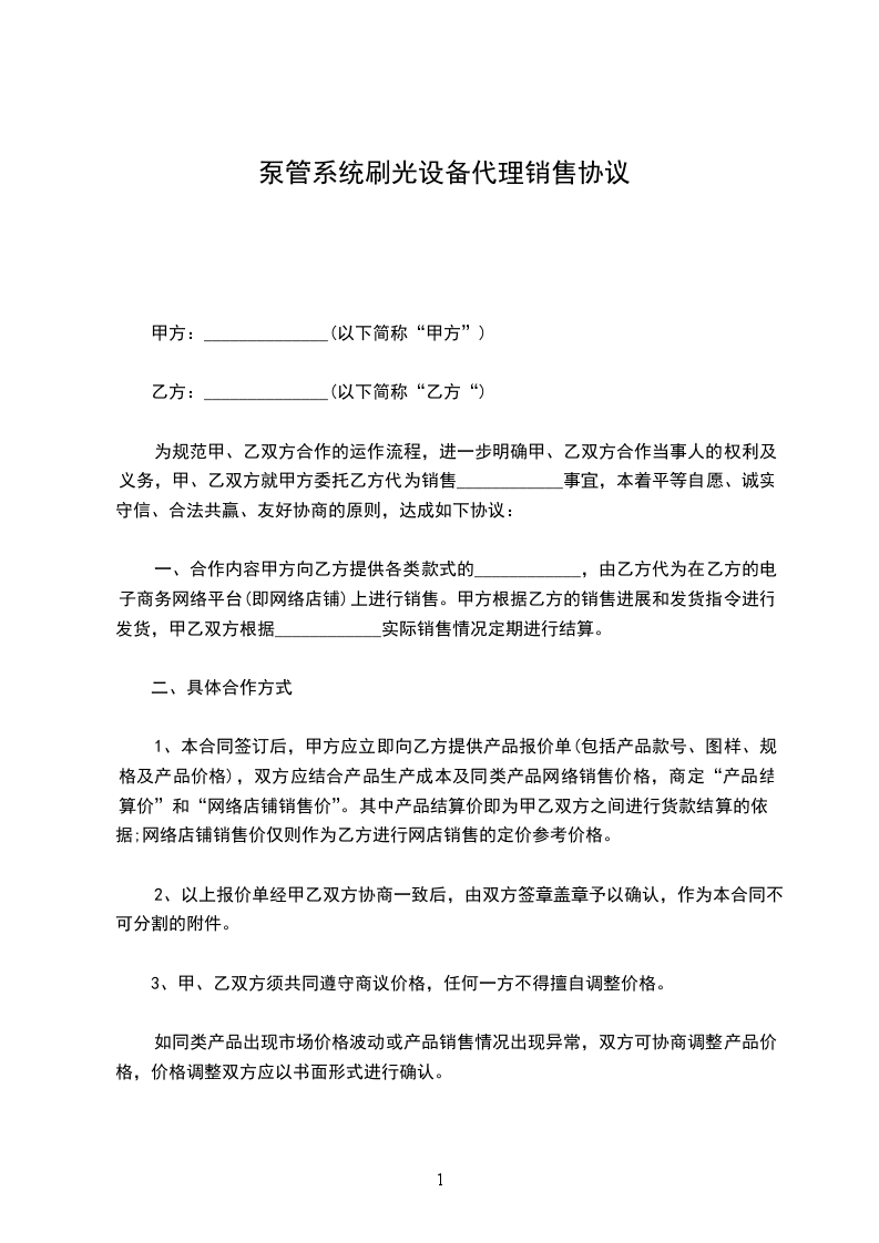 为规范甲、乙双方合作的运作流程,进一步明确甲、乙双方合作当事人的权利及义务,甲、乙双方就甲方委托乙方代为销售____________事宜,本着平等自愿、诚实守信、合法共赢、友好协商的原则,达成如下协议: