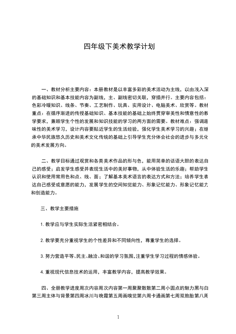 四、教育教学目标:知识和能力方面:通过观赏和各类美术作品的形与色,能用简单的话语大胆的表达自己的感受;启发学生感受并表现生活中的美好事物,从中体验生活的乐趣;帮助学生认识和使用常用色和点、线、面;了解基本美术语言的表达方式和方法;培养学生表达自己感受或意愿的能力,发展学生的空间知觉能力、形象记忆能力、形象记忆能力和创造能力。教学过程与方法:引导学生以个人或集体合作的方式参与欣赏、绘画、绘画创作等各种美术活动,尝试各种工具、材料和制作过程;以各种丰富多彩的活动方式丰富学生的视觉、触觉和审美经验;在美术活动过程中强调趣味性的美术学习,教学内容和活动方式要充分考虑开放性、立体性,培养学生的创新精神与实践能力,形成基本的美术素养。【摘要】教学计划是课程设置的整体规划,根据一定的教育目的和培养目标制定的教学和教育工作的指导文件。__为大家提供四年级美术下册教学计划,欢迎阅读!人教版四年级美术下册教学计划