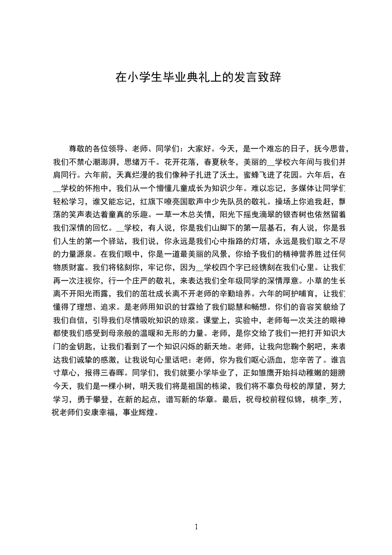 尊敬的各位领导、老师、同学们:大家好。今天,是一个难忘的日子,抚今思昔,我们不禁心潮澎湃,思绪万千。花开花落,春夏秋冬,美丽的__学校六年间与我们并肩同行。六年前,天真烂漫的我们像种子扎进了沃土,蜜蜂飞进了花园。六年后,在__学校的怀抱中,我们从一个懵懂儿童成长为知识少年。难以忘记,多媒体让同学们轻松学习,谁又能忘记,红旗下嘹亮国歌声中少先队员的敬礼。操场上你追我赶,飘荡的笑声表达着童真的乐趣。一草一木总关情,阳光下摇曳滴翠的银杏树也依然留着我们深情的回忆。__学校,有人说,你是我们山脚下的第一层基石,有人说,你是我们人生的第一个驿站,我们说,你永远是我们心中指路的灯塔,永远是我们取之不尽的力量源泉。在我们眼中,你是一道最美丽的风景,你给予我们的精神营养胜过任何物质财富。我们将铭刻你,牢记你,因为__学校四个字已经镌刻在我们心里。让我们再一次注视你,行一个庄严的敬礼,来表达我们全年级同学的深情厚意。小草的生长离不开阳光雨露,我们的茁壮成长离不开老师的辛勤培养。六年的呵护哺育,让我们懂得了理想、追求。是老师用知识的甘霖给了我们聪慧和畅想。你们的音容笑貌给了我们自信,引导我们尽情吸吮知识的琼浆。课堂上,实验中,老师每一次关注的眼神,都使我们感受到母亲般的温暖和无形的力量。老师,是你交给了我们一把打开知识大门的金钥匙,让我们看到了一个知识闪烁的新天地。老师,让我向您鞠个躬吧,来表达我们诚挚的感激,让我说句心里话吧:老师,你为我们呕心沥血,您辛苦了。谁言寸草心,报得三春晖。同学们,我们就要小学毕业了,正如雏鹰开始抖动稚嫩的翅膀。今天,我们是一棵小树,明天我们将是祖国的栋梁,我们将不辜负母校的厚望,努力学习,勇于攀登,在新的起点,谱写新的华章。最后,祝母校前程似锦,桃李_芳,祝老师们安康幸福,事业辉煌。