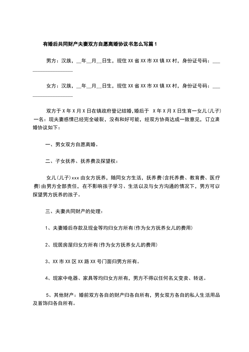 有婚后共同财产双方协商协议离婚书参考样板篇2