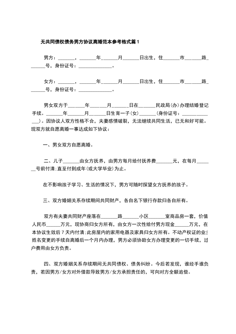 四、双方婚姻关系存续期间无共同债权、债务纠纷。今后若发现,谁经手谁负责,若因男方/女方对外借款导致男方/女方承担责任的,可向对方全额追偿。