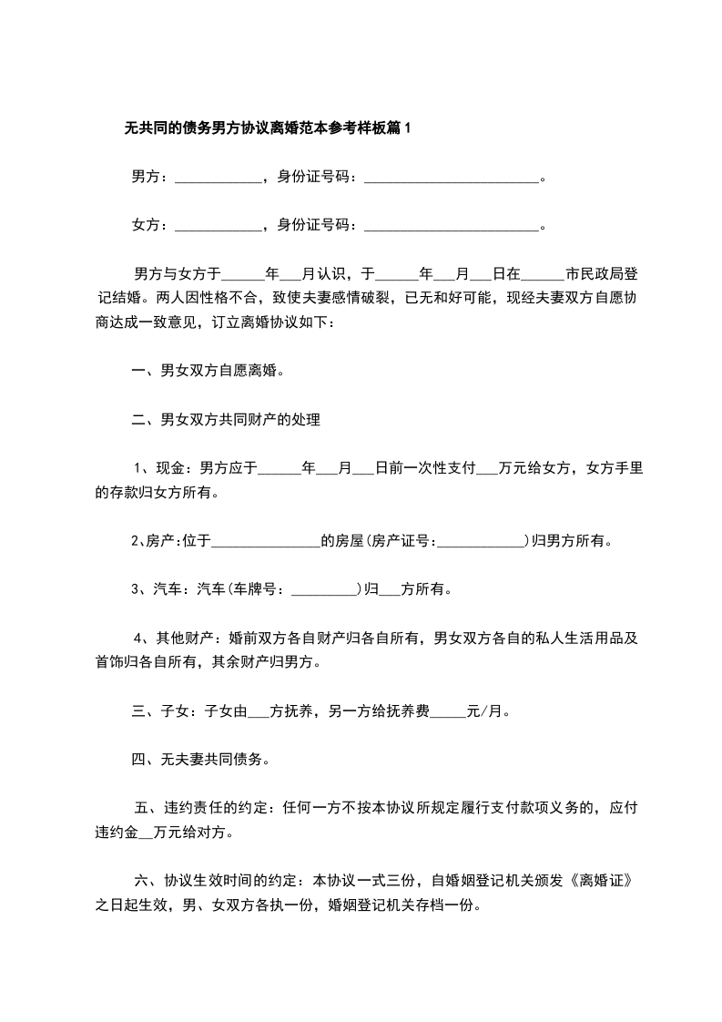 无共同的债务男方协议离婚范本参考样板篇1