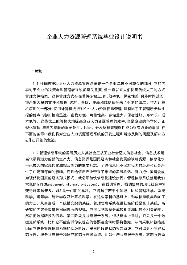 1.3企业人力资源管理信息系统的作用企业人力资源管理系统是一个协助各单位科学、全面、高效地进行企业人力资源管理的系统,它参考了哈佛人力资源管理理论,根植于国内企业人力资源管理的实际情况,实用而科学。在内容上,它包括了企业人力资源变动、员工培训、企业人力资源档案完整资料等内容。在操作上,它集输入、维护、查询、筛选、统计和各种处理为一体,信息导入导出可实现信息备份,灵活、专业的报表设计,形象、增强的数据处理。它既是管理人员的好管家,又是业务人员的好助手。建立企业人力资源处管理信息系统的目标是利用现代化的计算机管理手段,建立科学的企业人力资源信息管理系统,提高企业人力资源处的整体工作效率。该系统是针对通用公共行业专门开发的企业人力资源管理系统,该软件具有操作灵活、功能齐全等特点,是企业公司提高工作效率、加强企业信息化、自动化管理和提高企业形象所应必备的计算机软件系统之一。人力资源管理系统从科学的人力资源管理角度出发,从企业的人力资源规划开始,记录招聘、岗位描述、培训、个人信息、到离职等与员工个人相关的信息,并以易访问和可检取的方式储存到集中的数据库中,将企业内员工的信息统一地管理起来。完整的记载员工从面试开始到离职整个周期的岗位变迁、绩效等历史信息。该模块可管理较全面的人力资源和薪资数据,具有灵活的报表生成功能和分析功能,使得人力资源管理人员可以从繁琐的日常工作中解脱出来,同时综合性的报表也可供企业决策人员参考,如接受过的培训等关系的分析等。