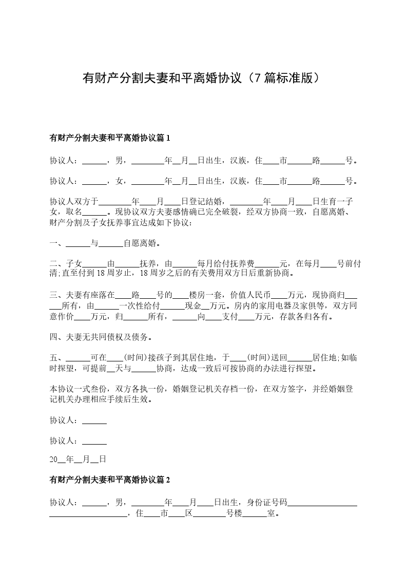 有财产分割夫妻和平离婚协议书参考样式篇7