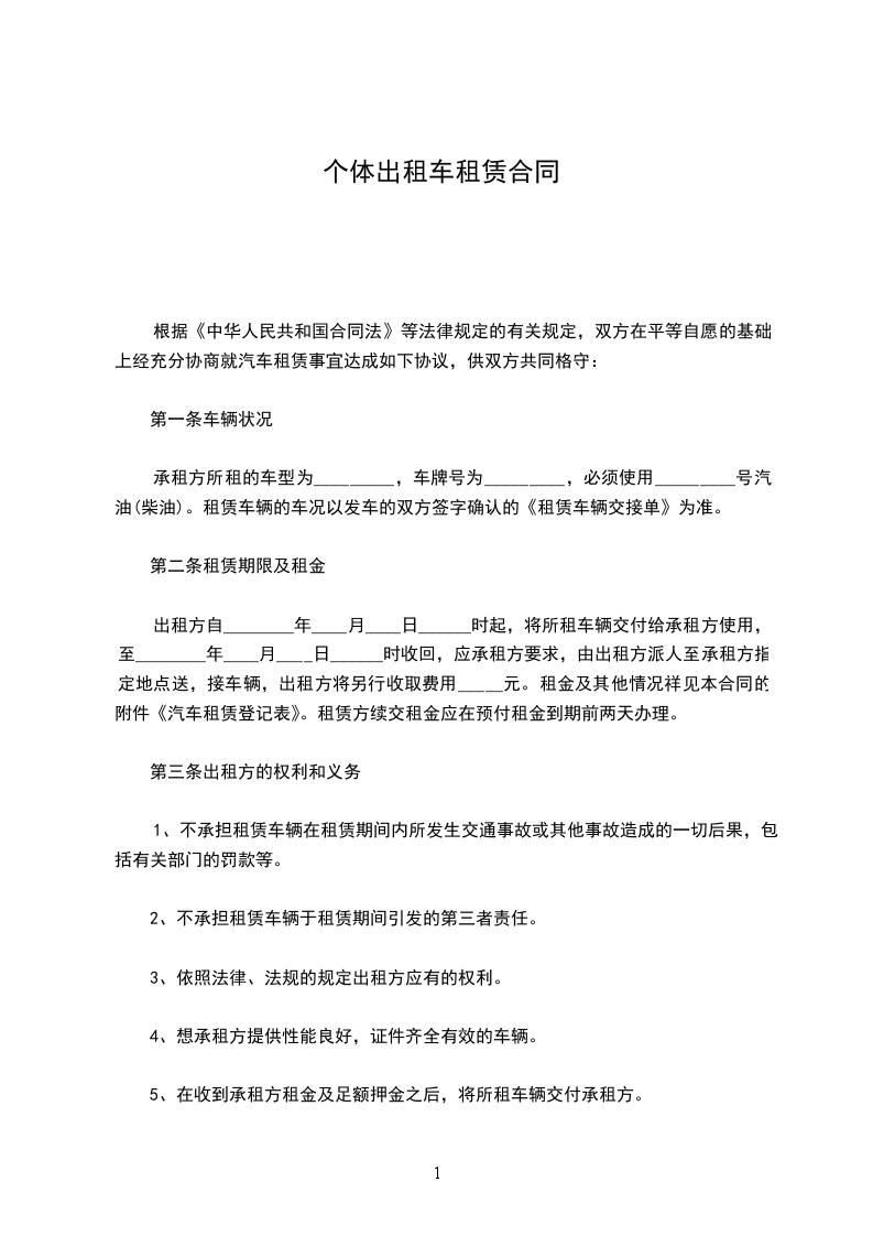 承租方所租的车型为_________,车牌号为_________,必须使用_________号汽油(柴油)。租赁车辆的车况以发车的双方签字确认的《租赁车辆交接单》为准。