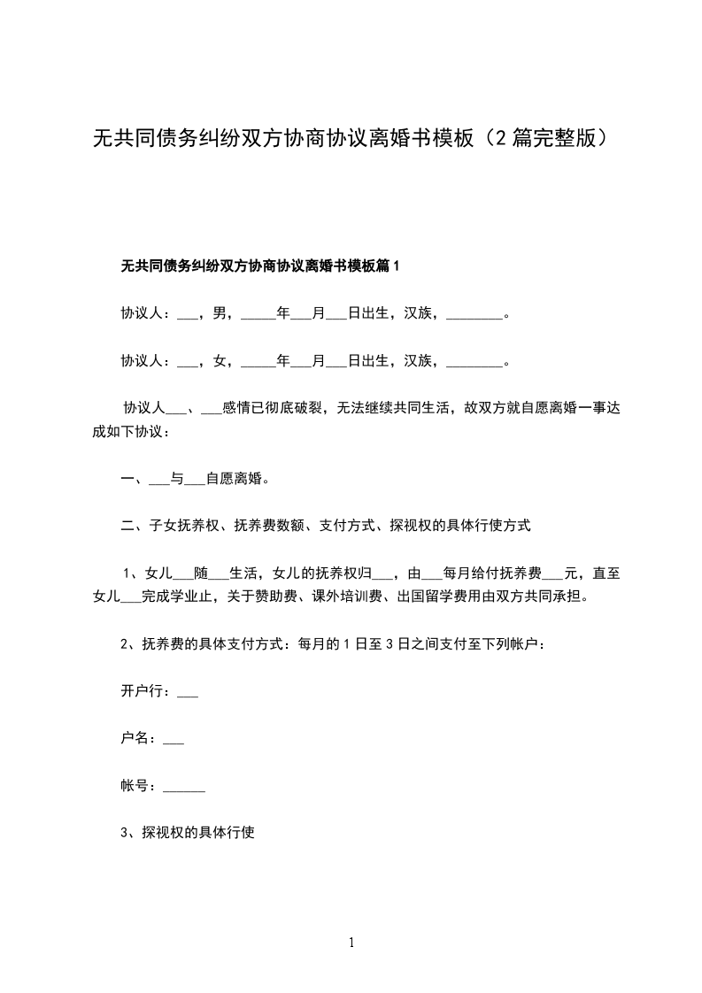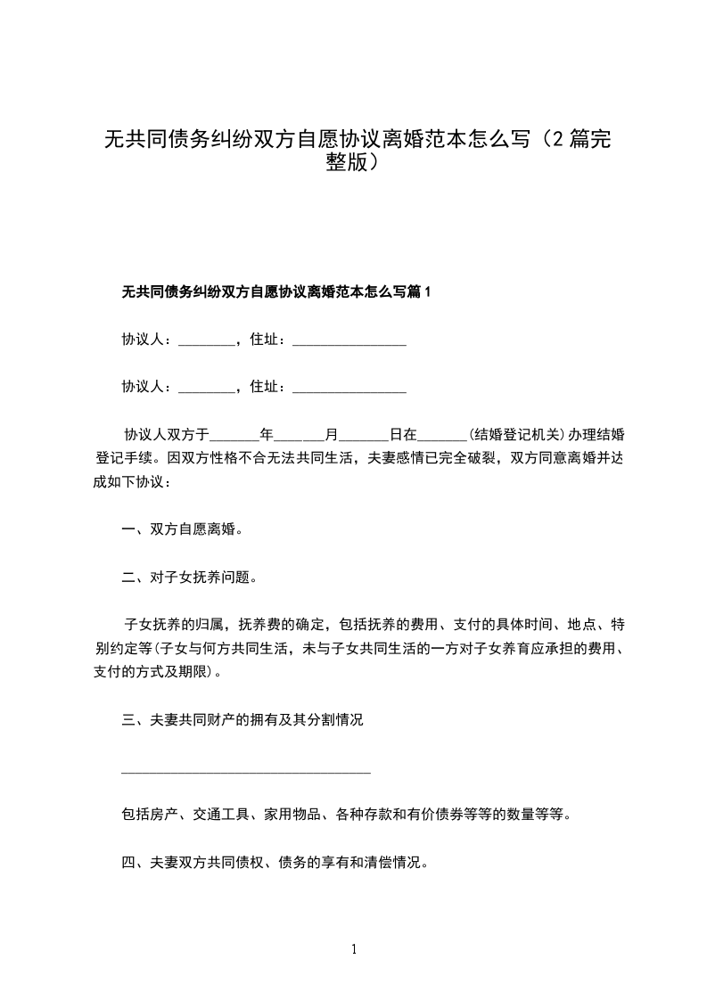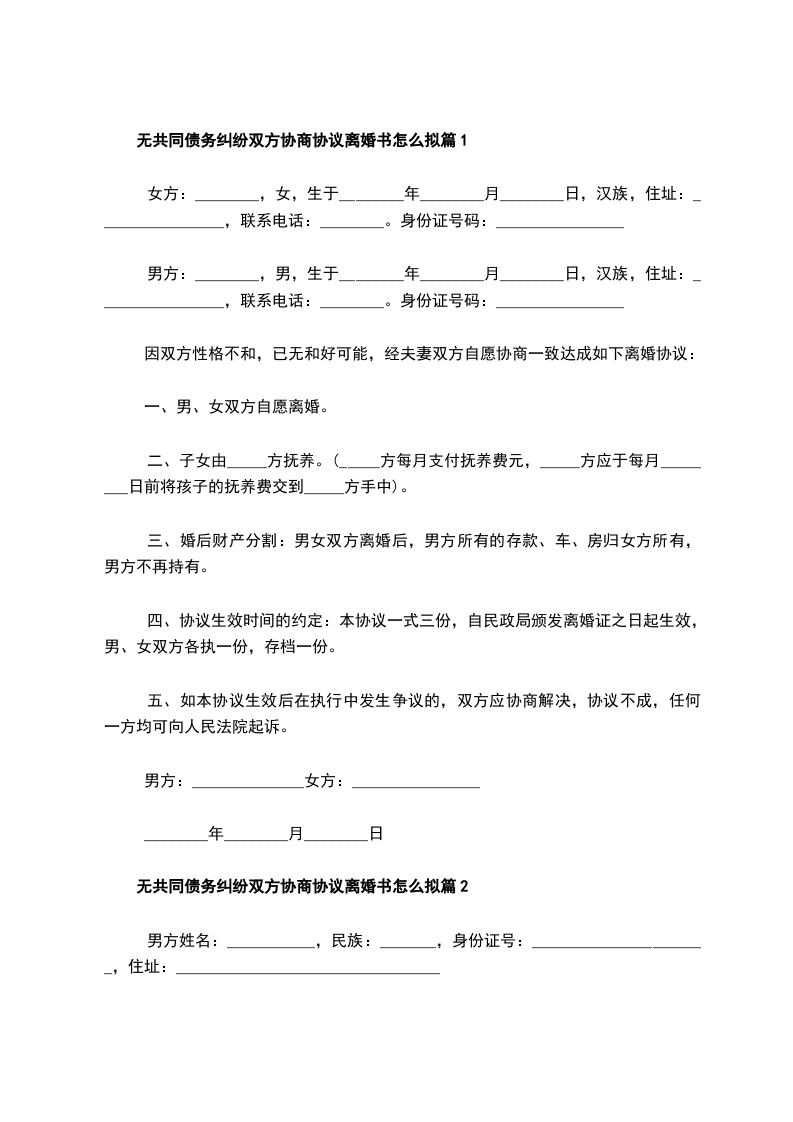 无共同债务纠纷双方协商协议离婚书模板篇2