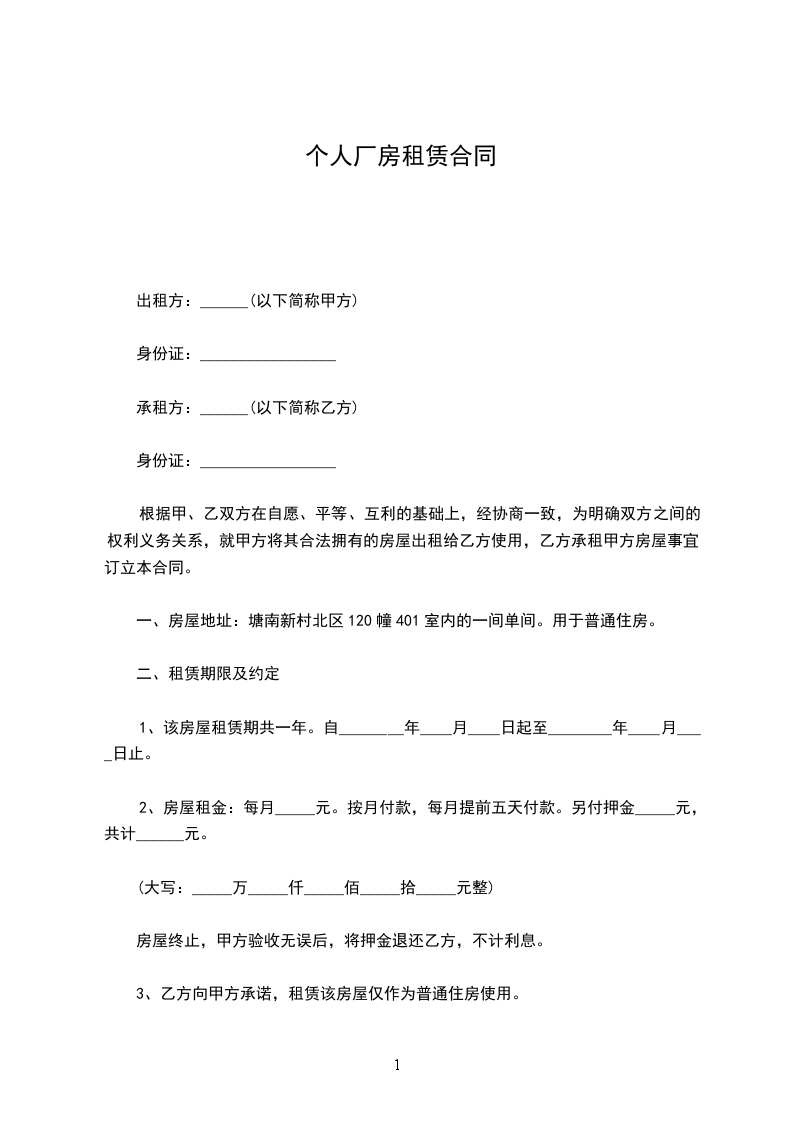 一、房屋地址:塘南新村北区120幢401室内的一间单间。用于普通住房。
