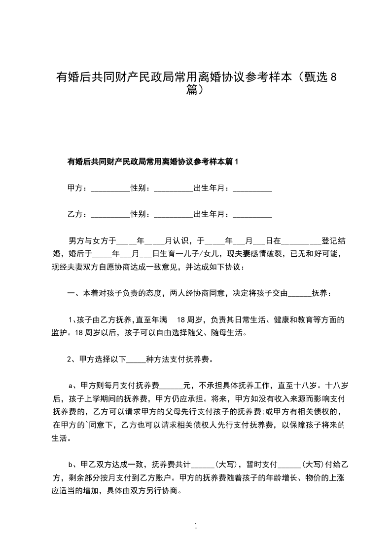 有婚后共同财产民政局常用离婚协议参考样本篇1
