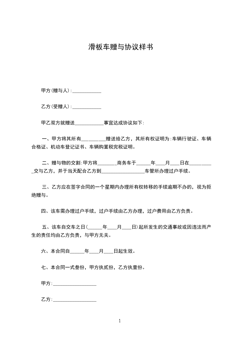 二、赠与物的交割:甲方将________商务车于______年____月____日在__________交与乙方,并于当天配合乙方到__________________车管所办理过户手续。
