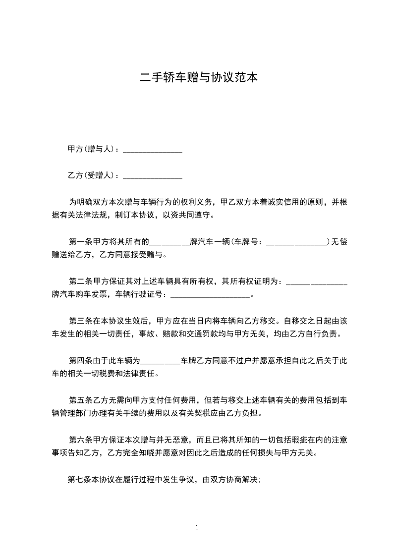 第一条甲方将其所有的__________牌汽车一辆(车牌号:_______________)无偿赠送给乙方,乙方同意接受赠与。