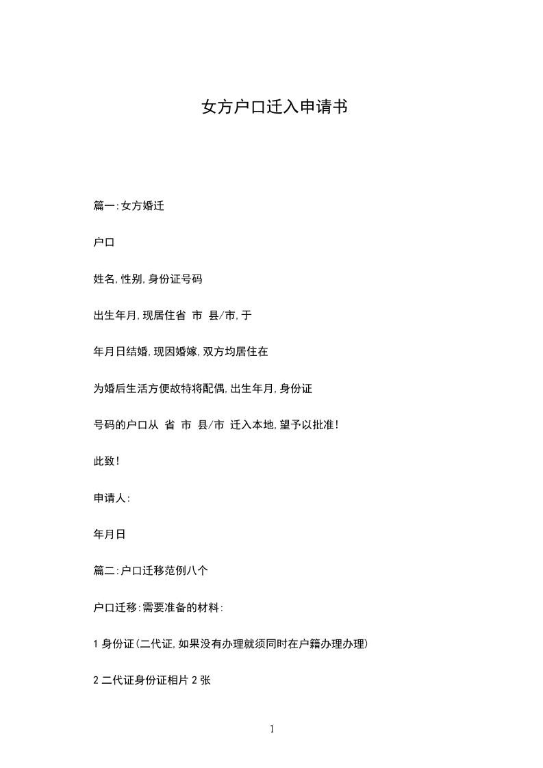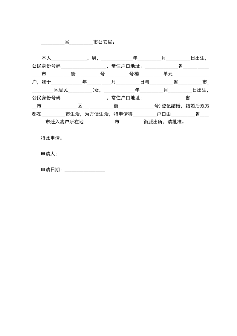 本人_______________,男,_____________年__________月__________日出生,公民身份号码___________________,常住户口地址:______________省_______________市__________街__________号__________号楼__________单元_______________户,我于_____________年__________月__________日与__________省__________市__________区居民__________(女,_____________年__________月__________日出生,公民身份号码___________________,常住户口地址:_________________省__________市_______________区_____________街_______________号)登记结婚,结婚后双方都在__________市生活,为方便生活,特申请将__________户口由__________省__________市迁入我户所在地_____________市__________街派出所,请批准。