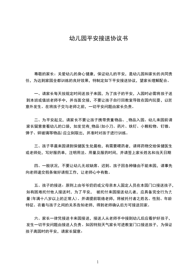 尊敬的家长:关爱幼儿的身心健康,保证幼儿的平安,是幼儿园和家长的共同责任,为达到家园全都训练的良好效果,特制定如下平安接送协议,望家长理解配合。
