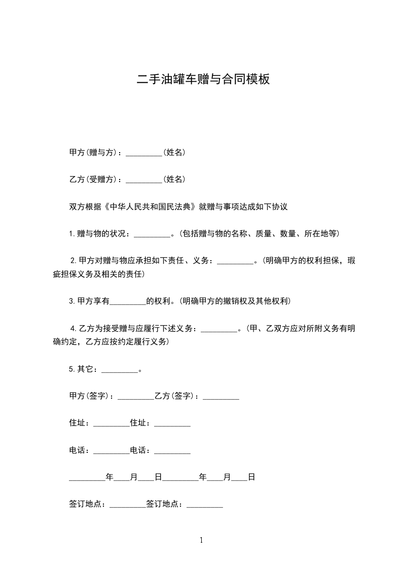 二手油罐车赠与合同模板