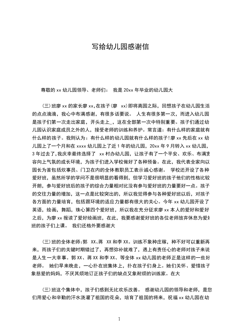 (三)班廖xx的家长廖xx,在孩子(廖xx)即将离园之际,回想孩子在幼儿园生活的点点滴滴,我心中布满感谢,有很多话要说。 人生有很多第一次,而进入幼儿园是孩子们第一次走出家庭,开头走上_,这在全部第一次中特别重要。孩子们通过幼儿园认识家庭成员之外的人,接受老师的训练和养护。常言道:有什么样的家庭就有什么样的孩子。我则认为:有什么样的幼儿园就有什么样的孩子!廖xx先后在xx幼儿园上了一个月和在xxxx幼儿园上了近1年的幼儿园,20xx年9月转入xx幼儿园,3年过去了,我庆幸最终选择了xx村办幼儿园,让孩子有了一个平安、欢乐、布满宽容向上气氛的成长环境,为孩子们进入学校做好了各种预备。在此,我代表全家向以园长为首包括炊事员、门卫在内的全体教职员工表示诚心感谢。 学校还开设了各种爱好班,虽然所学的学问不是很明显的看得到,但学习爱好班的孩子他们的性格比较开朗,参与爱好班后的孩子的综合力量相对比没有参与爱好班的力量要好一点。孩子的交往力量的增加,这一点是比较突出的,所以我觉得参与各种爱好班以后,对孩子各方面的力量培育,包括跟环境的适应力量都有很大的关心。今年xx幼儿园开设了英语,绘画,舞蹈,珠心算四个爱好班,所以我在充分征求廖xx本人的爱好和爱好之后,为廖xx报读了爱好绘画班,在此,我要感谢爱好班的各位老师放弃休息为爱好班的孩子们上课。 我们还格外要感谢大