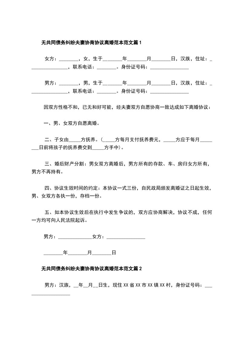 无共同债务纠纷夫妻协商协议离婚范本范文篇1