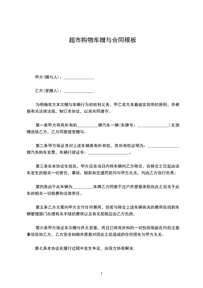 第一条甲方将其所有的__________牌汽车一辆(车牌号:_______________)无偿赠送给乙方,乙方同意接受赠与。