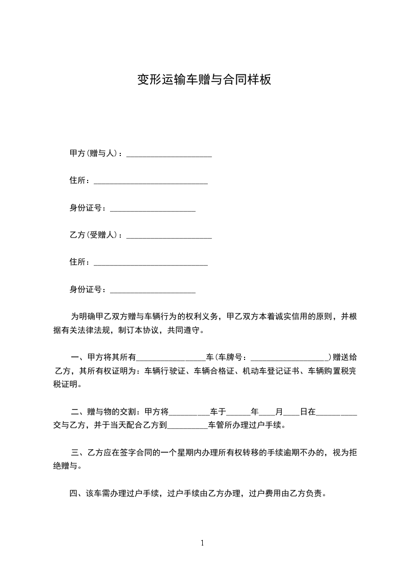 一、甲方将其所有_________________车(车牌号:___________________)赠送给乙方,其所有权证明为:车辆行驶证、车辆合格证、机动车登记证书、车辆购置税完税证明。