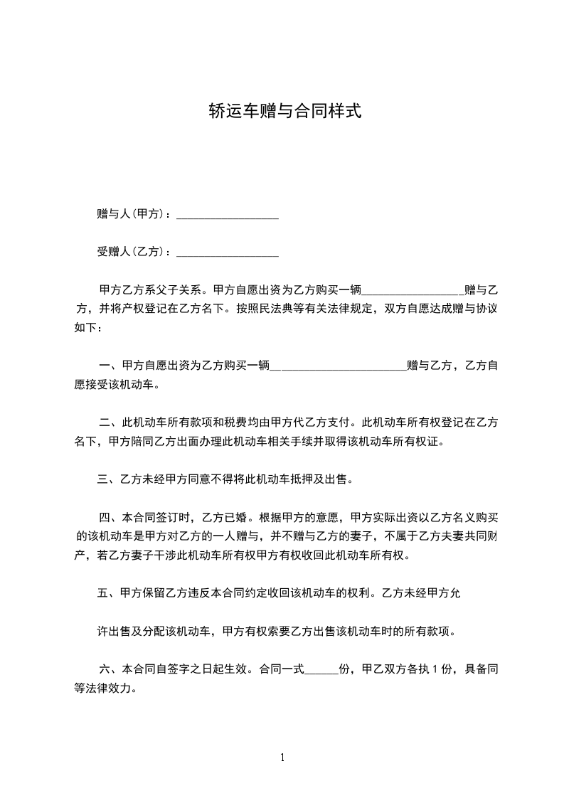 甲方乙方系父子关系。甲方自愿出资为乙方购买一辆__________________赠与乙方,并将产权登记在乙方名下。按照民法典等有关法律规定,双方自愿达成赠与协议如下: